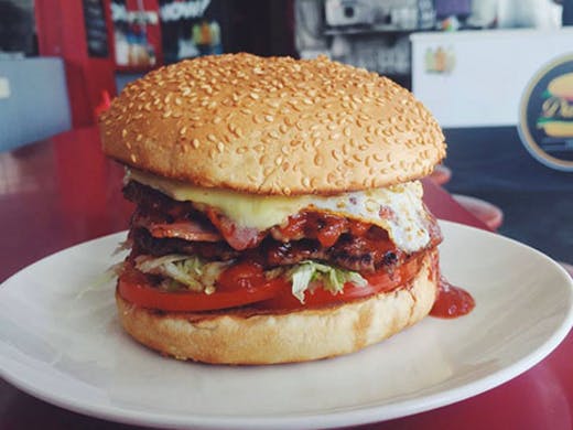 Nz Premium grass fed Angus Beef, Topped with American Smoked Cheese, smoked bacon, Beer battered onion ring and free range fried egg, Sriracha Mayo, lettuce on our toasted gourmet bun!