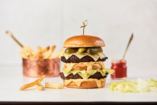 Premium 4 beefpatties topped with four American smoked Cheddar cheese, 4 maple smoked bacon, one fried egg and one hashbrown with bourbon BBQ and mascarpone aioli, and lettuce.