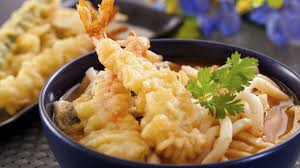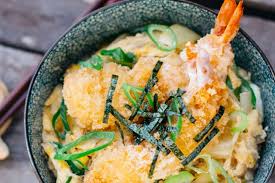 3pcs tempura prawn with pan fried vegetable and egg sauce on rice...
