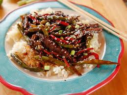 Beef with fried vegetable sauce and spring onion on rice...