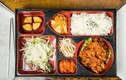 Hot chilli pork(chicken), fresh salad, sushi, side dish and rice + miso