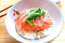 Fresh Salmon, fish roe, fresh vegetable with hot chili sauce on rice