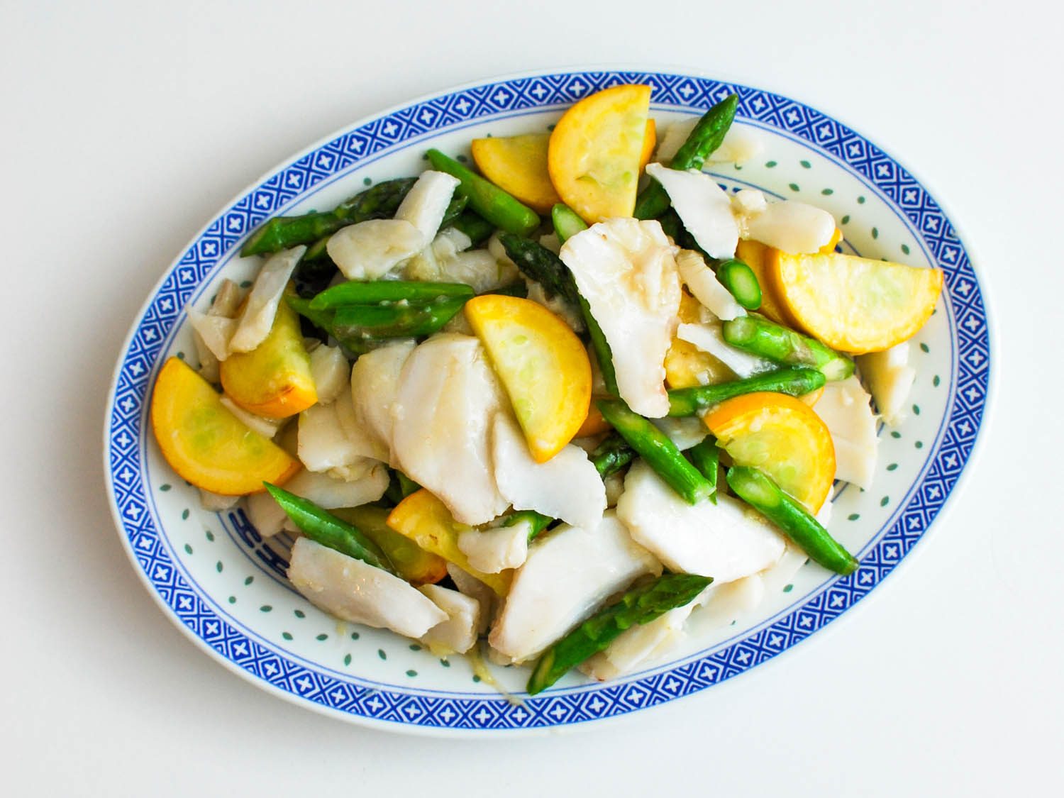 Oyster sauce, snow peas, scallops, soy sauce, noodles...